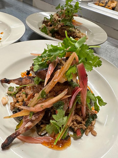Grilled quail, lavender honey glaze, black garlic farro, troon vineyard rainbow chard. Pickled stem and celery root salad.